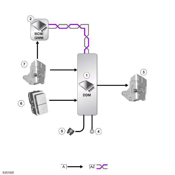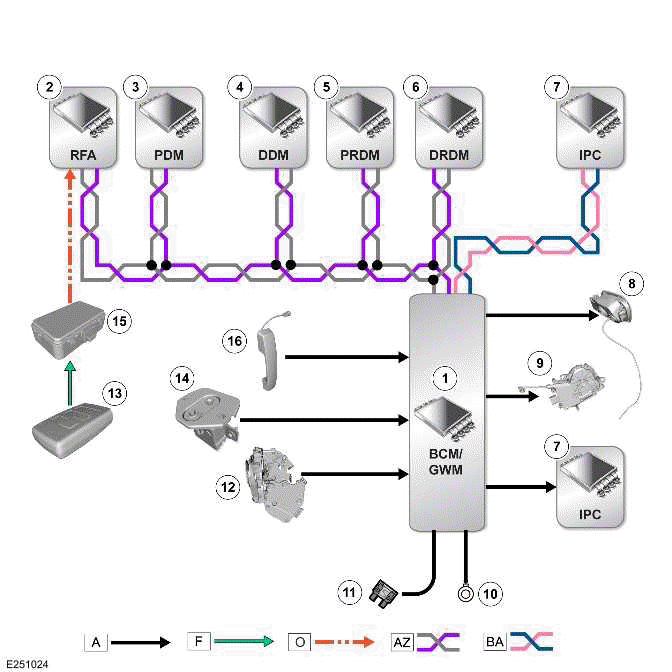 A = HARDWIRED: F = RF TRANSMISSION: O = LIN: AZ = HS CAN BODY SYSTEMS BUS: