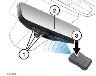 1. With the ignition switched on, press and release the required HomeLink button (1). The LED indicator (2) flashes orange.