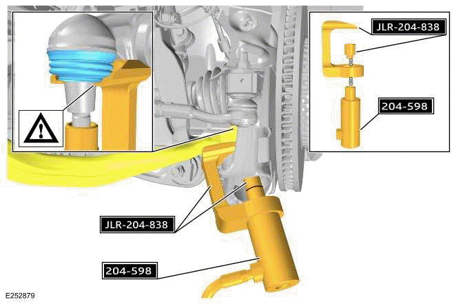 CAUTION: Make sure the special tool is correctly located and the lower ball joint boot is not damaged while carrying out the operation. Failure to follow this instruction may result in damage to the component.
